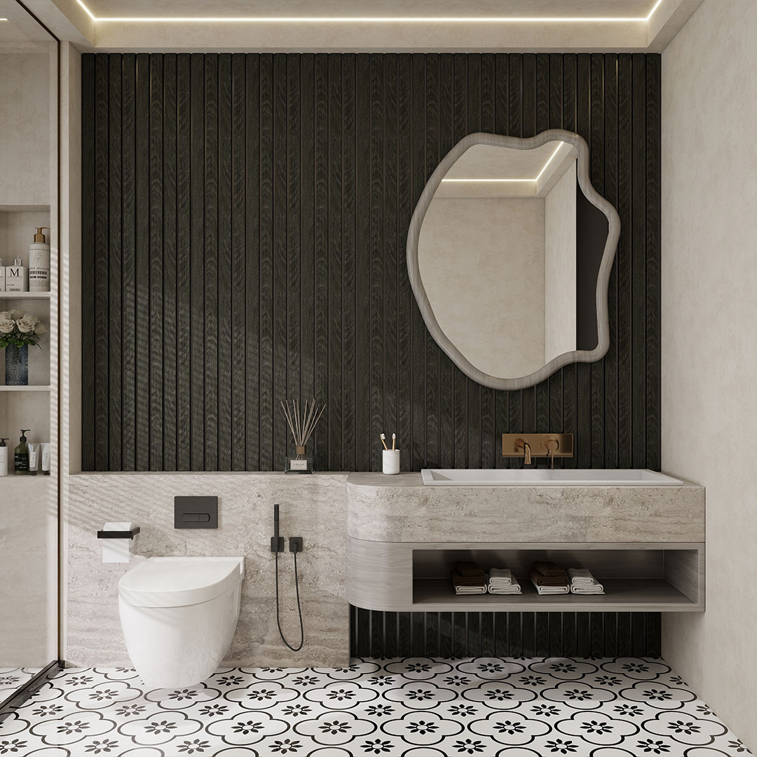 A waterproof 4 slat panel delivering a bold architectural finish with strong visual contrast. Engineered for long lasting performance in areas exposed to moisture while maintaining a sleek contemporary look.