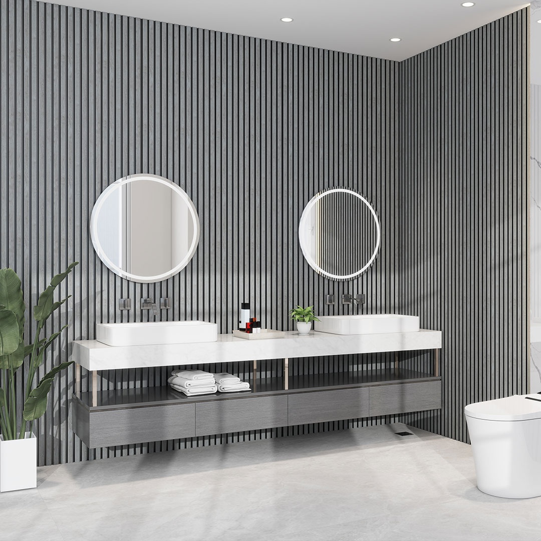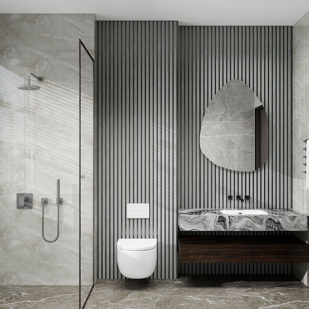 A waterproof 6 slat panel combining contemporary grey tones with natural wood character. Suitable for modern interior schemes that require durability and resistance to humidity.