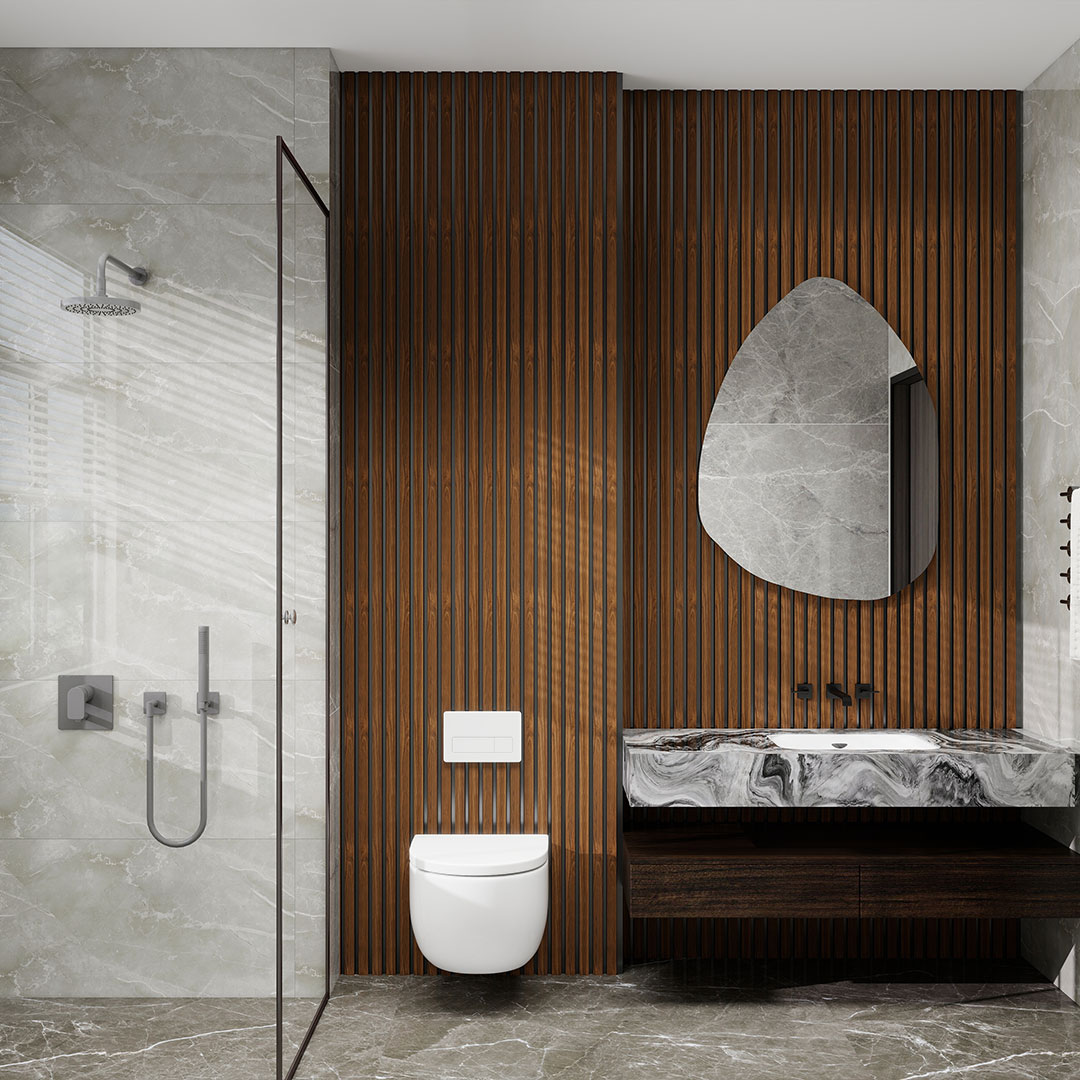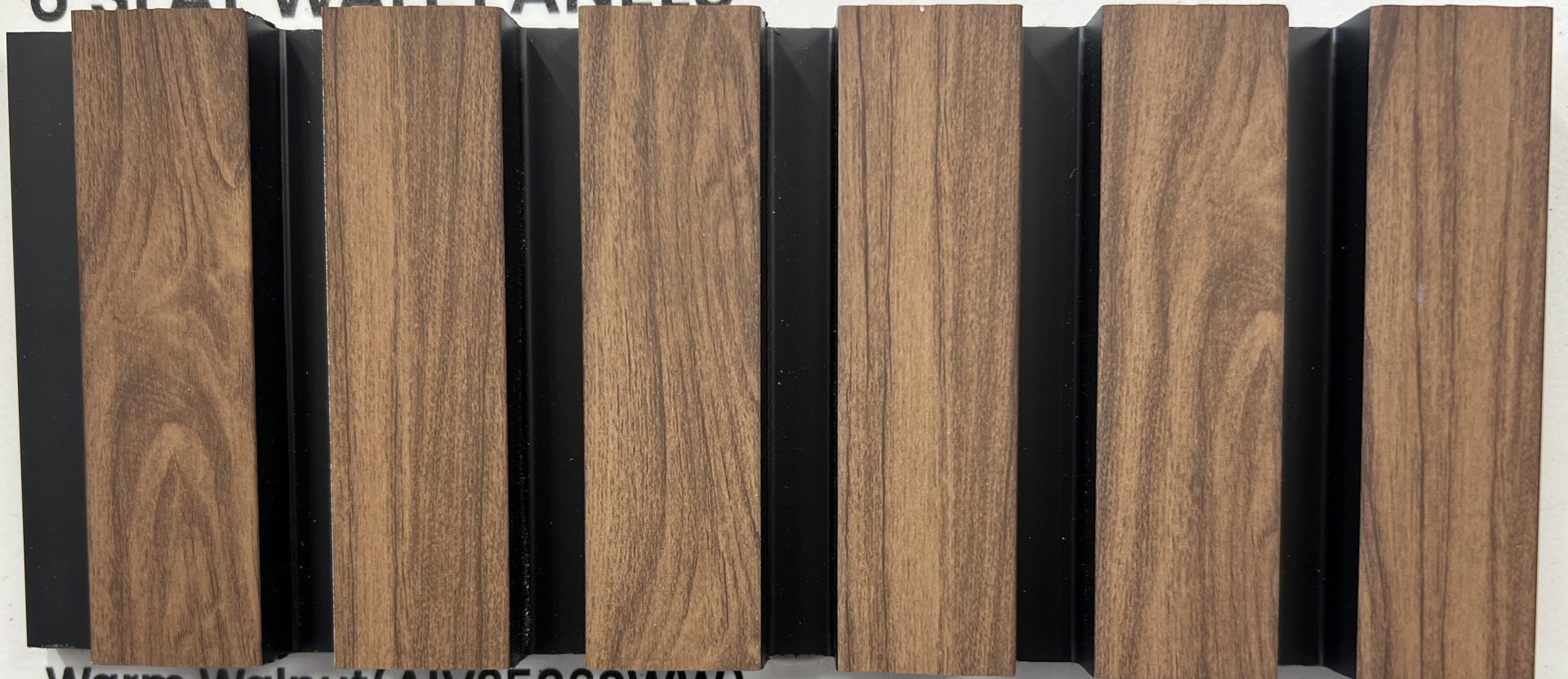 A waterproof 6 slat panel offering a deeper wood aesthetic with refined texture. Ideal for feature walls and statement installations requiring both visual impact and moisture resistance.