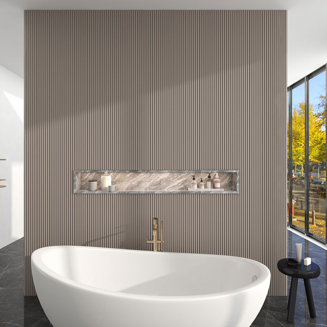 Aluvo Taupe Half Round Slat Panels are engineered to provide balanced neutral depth with structured vertical rhythm. Designed for contemporary interiors demanding both style and resilience.