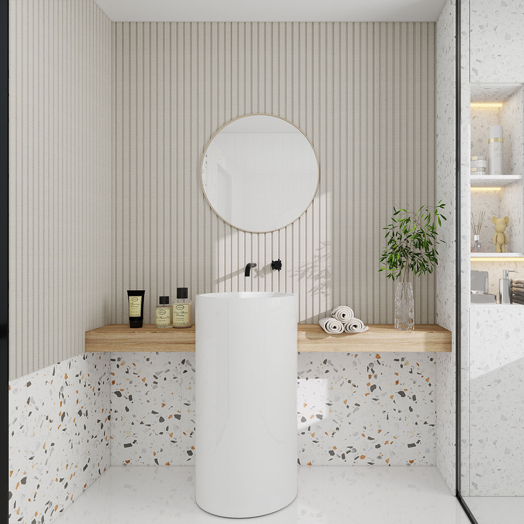 Fully waterproof woven slat panel featuring a subtle textile inspired texture for added surface depth. Designed to deliver refined vertical detail with enhanced tactility for residential and commercial interiors.