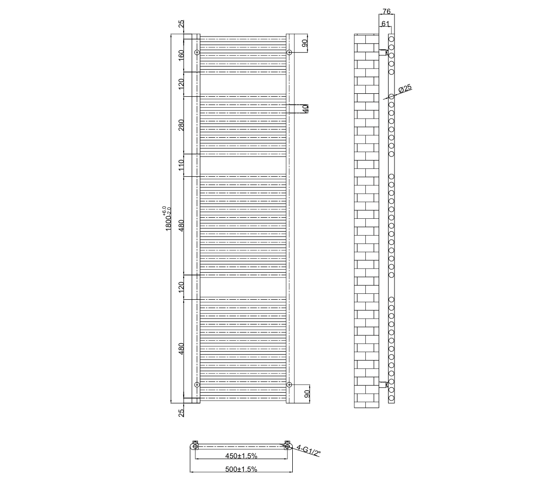 H1800 x W500mm, Pipe Centres (+/- 2mm variance) – 450mm, Tube (pcs) – 5+8+13+13, BTU (50°C) – 3159, BTU (60°C) – 3949