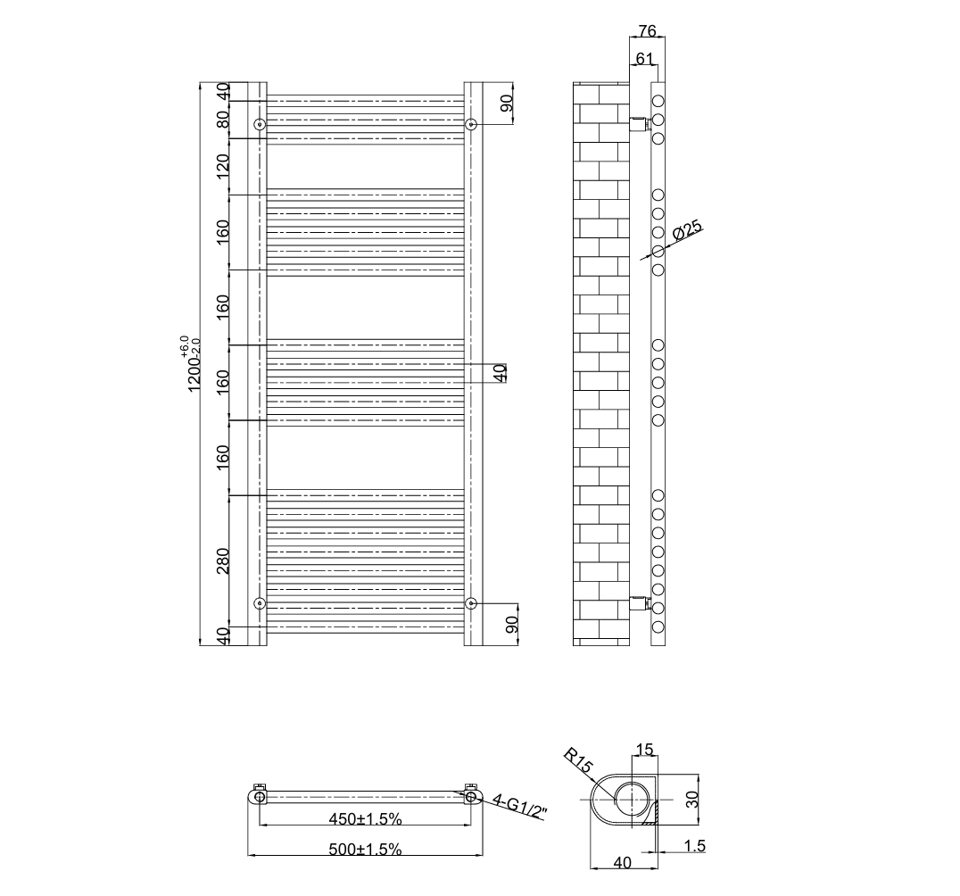 H1200 x W500mm, Pipe Centres (+/- 2mm variance) – 450mm, Tube (pcs) – 3+5+5+8, BTU (50°C) – 1802, BTU (60°C) – 2253
