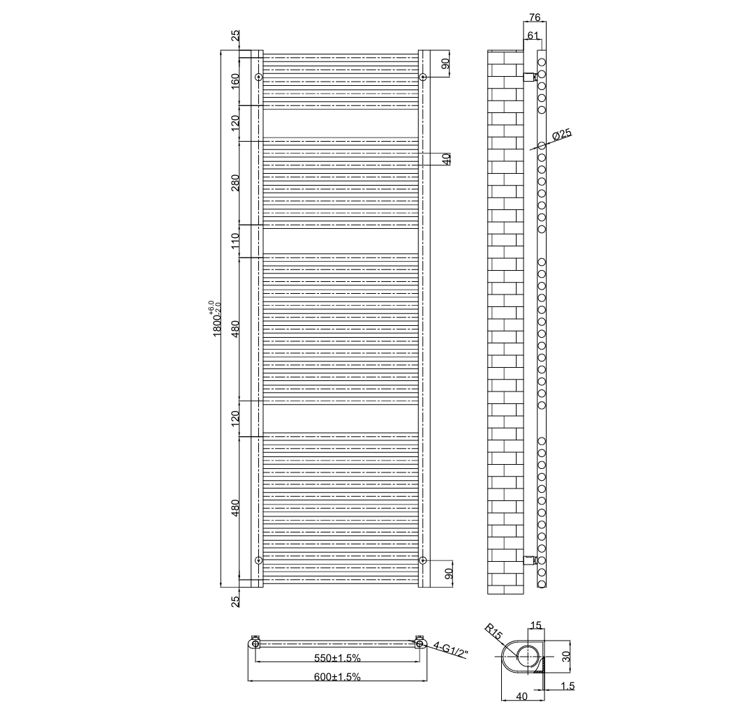 H1800 x W600mm, Pipe Centres (+/- 2mm variance) – 550mm, Tube (pcs) – 5+8+13+13, BTU (50°C) – 3686, BTU (60°C) – 4608