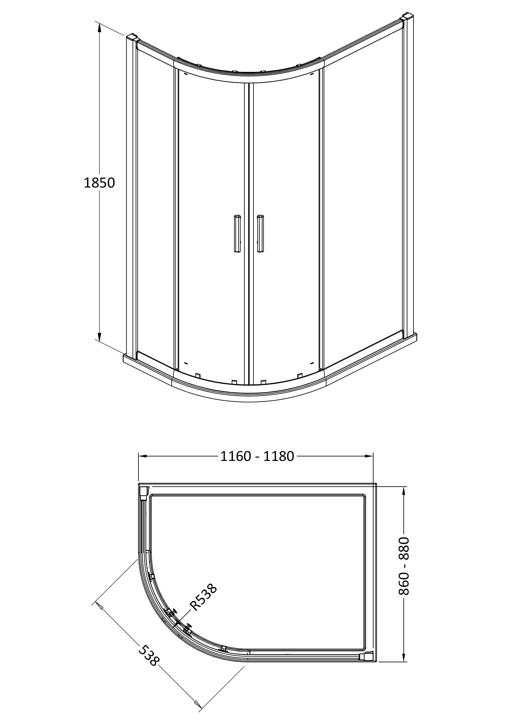 D880 x H1850 x W1180mm, Enclosure Adjust – 860/880mm – 1160/1180mm, Radius – 538mm, Opening – 520mm