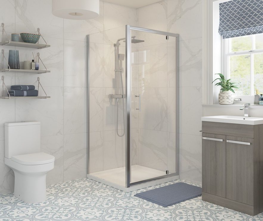A stylish twist on a classic design that fits perfectly in any modern bathroom, the door on a pivot door shower enclosure opens fully giving the advantage of full extent wider access, whilst only taking up a small area of your bathroom. Pivot Door shower enclosures can be used in a recess or with a side panel and are a popular option for en-suite bathrooms!