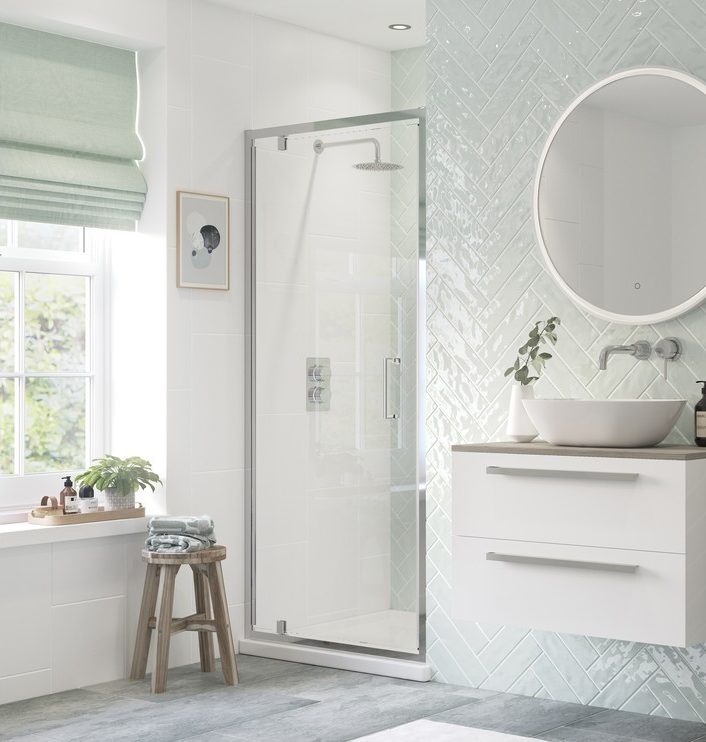 A stylish twist on a classic design that fits perfectly in any modern bathroom, the door on a pivot door shower enclosure opens fully giving the advantage of full extent wider access, whilst only taking up a small area of your bathroom. Pivot Door shower enclosures can be used in a recess or with a side panel and are a popular option for en-suite bathrooms!