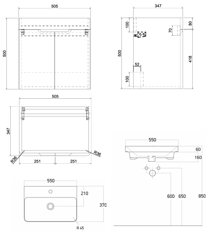 H 560 x W 550 x D 370mm inc. Basin