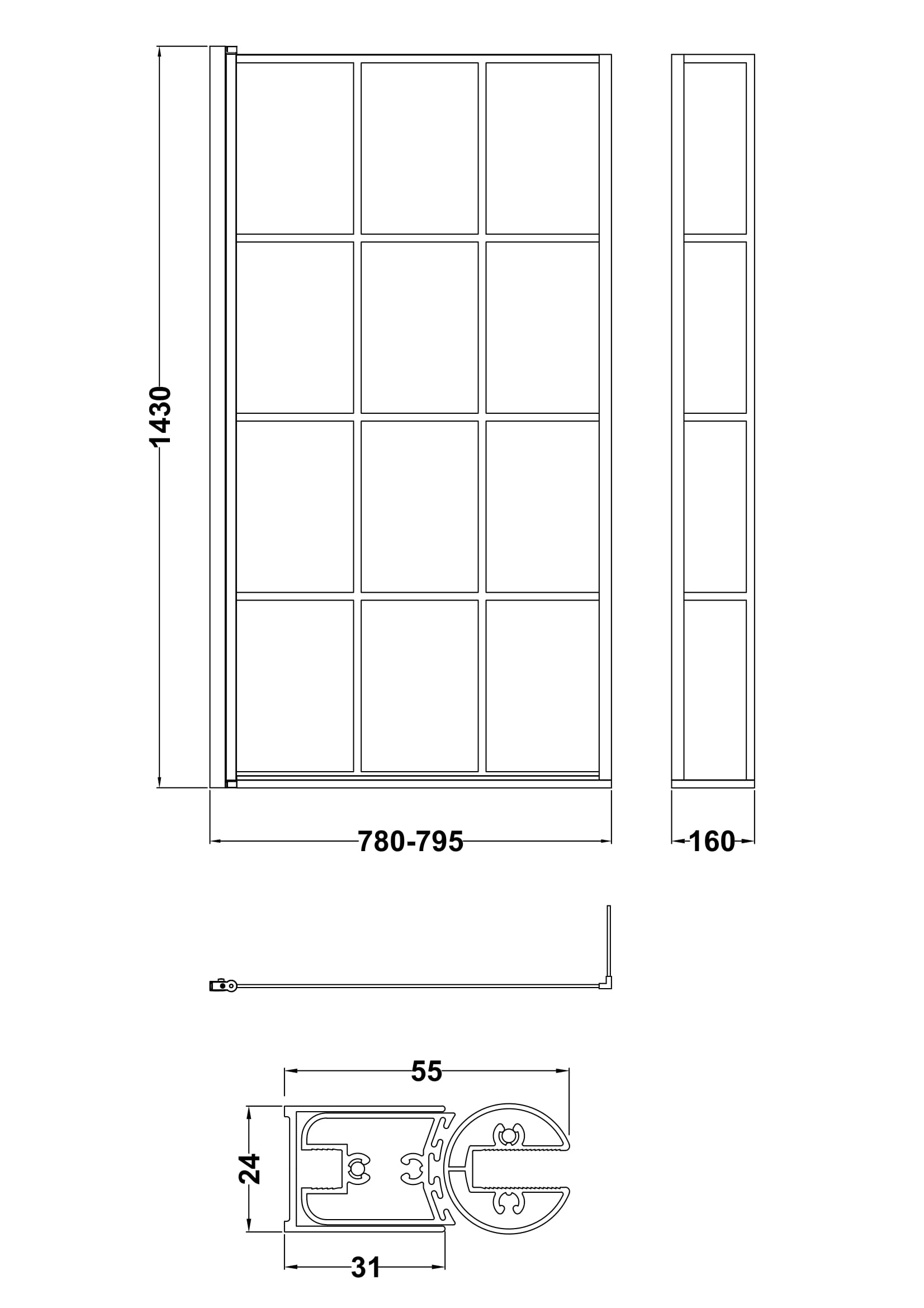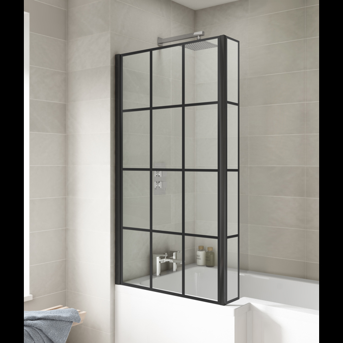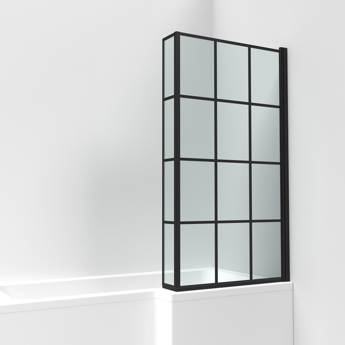 Nuie Pacific 6mm L-Shape Framed Hinged Bath Screen With Fixed Return – Matt Black