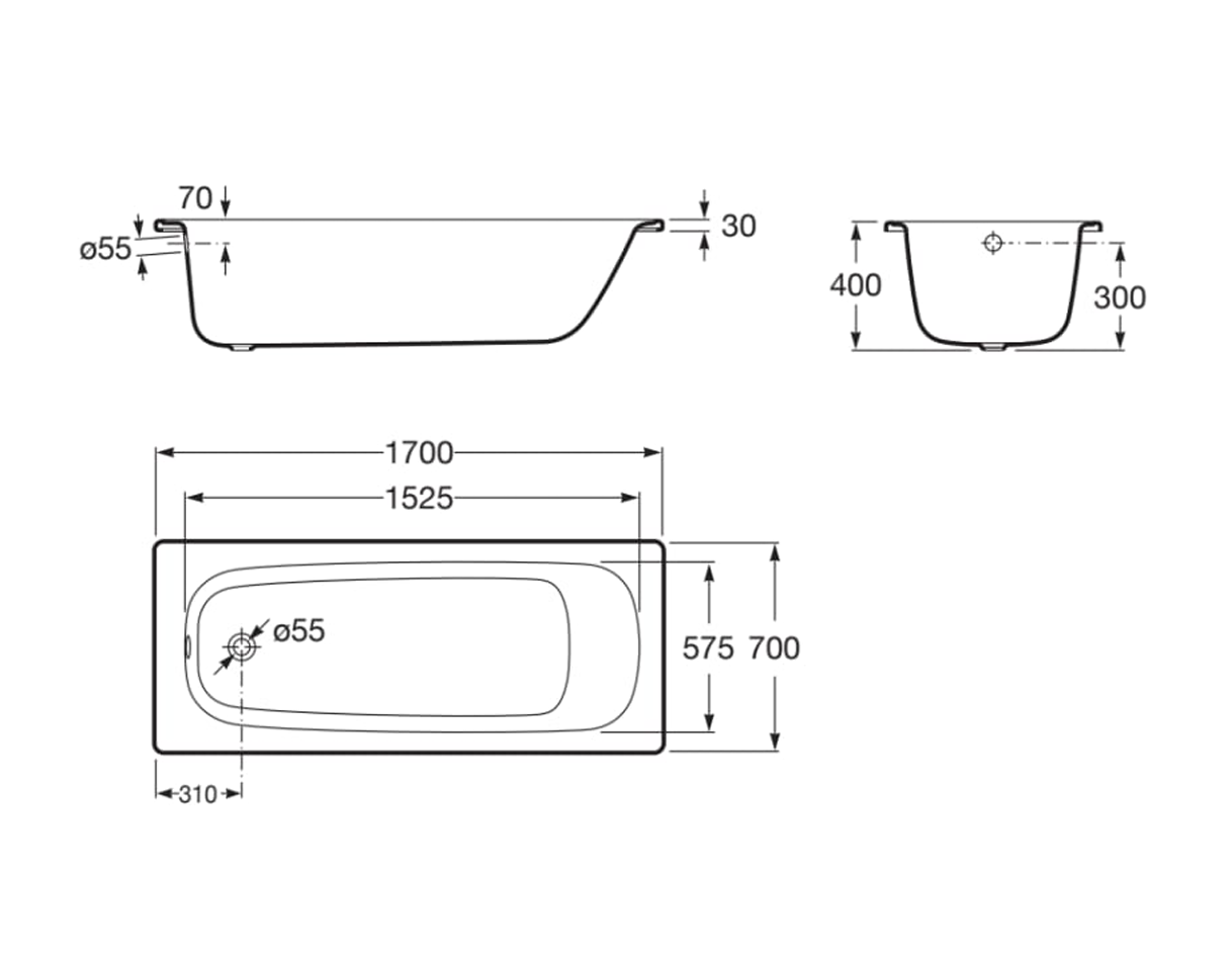 Roca Contesa Single Ended Rectangular Steel Bath 1700x700mm – 2 Taphole