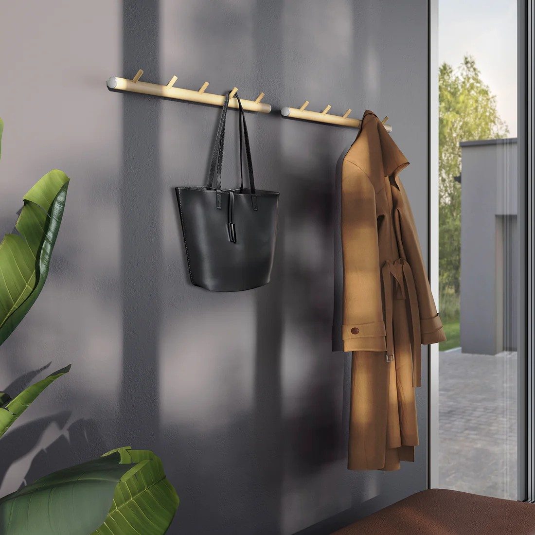 Horizontal coat rack designed with a round dowel made of untreated beech and gray aluminum details. Maximize storage and create a harmonious expression in the hallway, inspired by Scandinavian nature. The coat rack is equipped with 5 hooks.