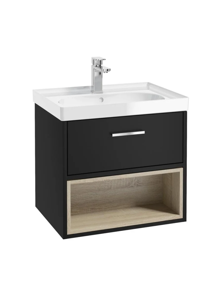 Sonas Malmo 600mm 1 Drawer Wall Hung Vanity Unit with Open Oak Shelf & Gloss Ceramic Basin – Matt Black